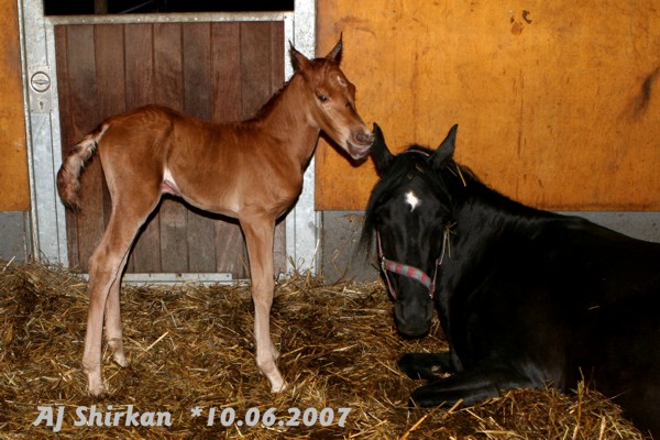 Am 10. Juni um ca. 4:30 Uhr hat Skarabell ein Hengstfohlen mit dem Namen AJ Shirkan zur Welt gebracht. Wie immer bei Skarabell gab es keine Probleme. Shirkan mischt inzwischen unsere Herde ganz schön auf, er hat vor nichts und niemandem Angst.