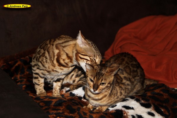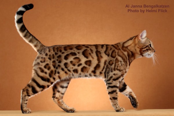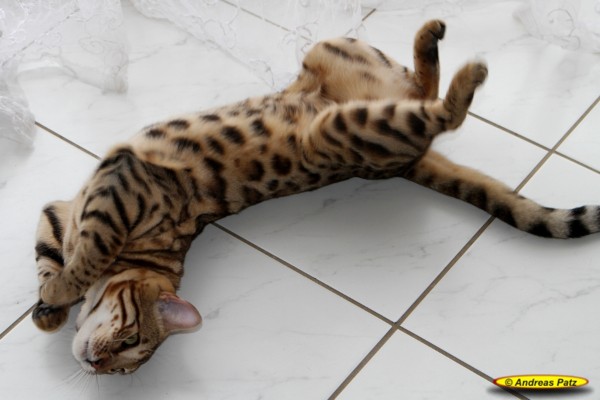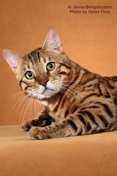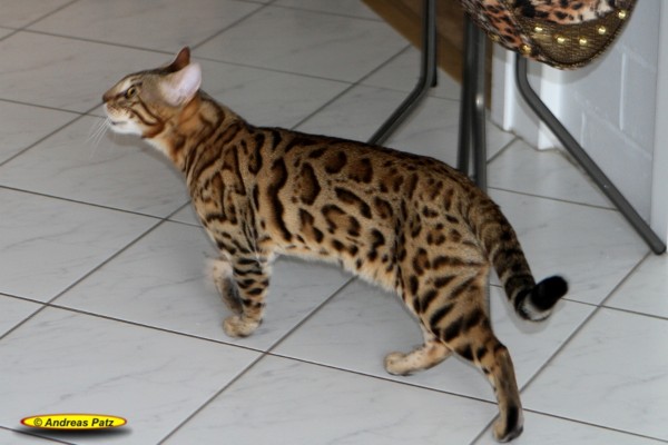 Er hat tolle Rosetten, einen traumhaften Kopf und einen super Körperbau. Sein Schwanz ist wie bei den Bengalen gewünscht kurz und dick. Er hat einen tollen Wildtyp und ist dabei sehr groß (schon 5,5 Kg mit zehn Monaten). Bronte ergänzt unser Zuchtprogramm in idealer Weise. Wir danken Kelly, dass sie uns diesen tollen Ausnahme-Kater anvertraut hat.