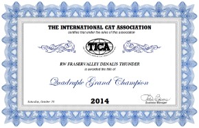 Auf nur drei Ausstellungen hat er bei uns sensationell den höchsten persönlichen Titel "Supreme Grand Champion" geholt (dieser beinhaltet insgesamt sechs Titel: 1. Champion, 2. Grand Champion, 3. Double Grand Champion, 4. Triple Grand Champion, 5. Quadruple Grand Champion, 6. Supreme Grand Champion)
