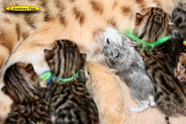 25.03.2008 Das Meerschweinchen von Michelle hat Junge bekommen und hatte keine Milch für diese. Leider haben die Kleinen mit der Flasche nicht zugenommen und wir dachten schon, wir können sie nicht retten. Beim füttern hat unsere Bengalkatze Chay interessiert zugeschaut und nicht gefaucht. Wir haben ihr daraufhin die drei Meerschweinchen für ein paar Tage anvertraut. Chay hat die drei sofort adoptiert und passt auf sie genauso auf, wie auf ihre fünf Bengalkitten.