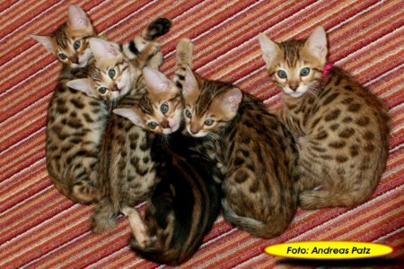 Zucht-Bengalkater Al Jannas Best of Xtreme (2.von rechts). In diesem Alter darf die Zeichnung noch das Fuzzy Fell haben, die sie etwas verschwimmen läßt. Das wird bei den guten Linien mit 3-6 Monaten komplett klar (wie man an dem erwachsenen Kater sieht- bei einem Klick auf das Bild gelangen Sie zu seiner Seite).